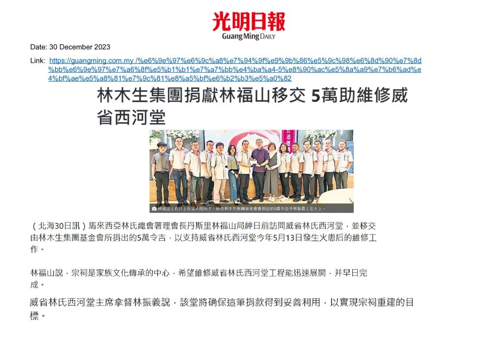 2023.12.30 Guang Ming – Lim Hock San handling over RM50,000 donated by LBS Group Foundation to support renovations on Lim See Sai Hoe Tong
