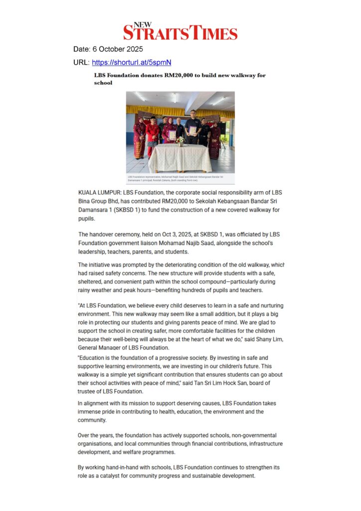 2025.10.06 – New Straits Times – LBS Foundation donates RM20,000 to build new walkway for school