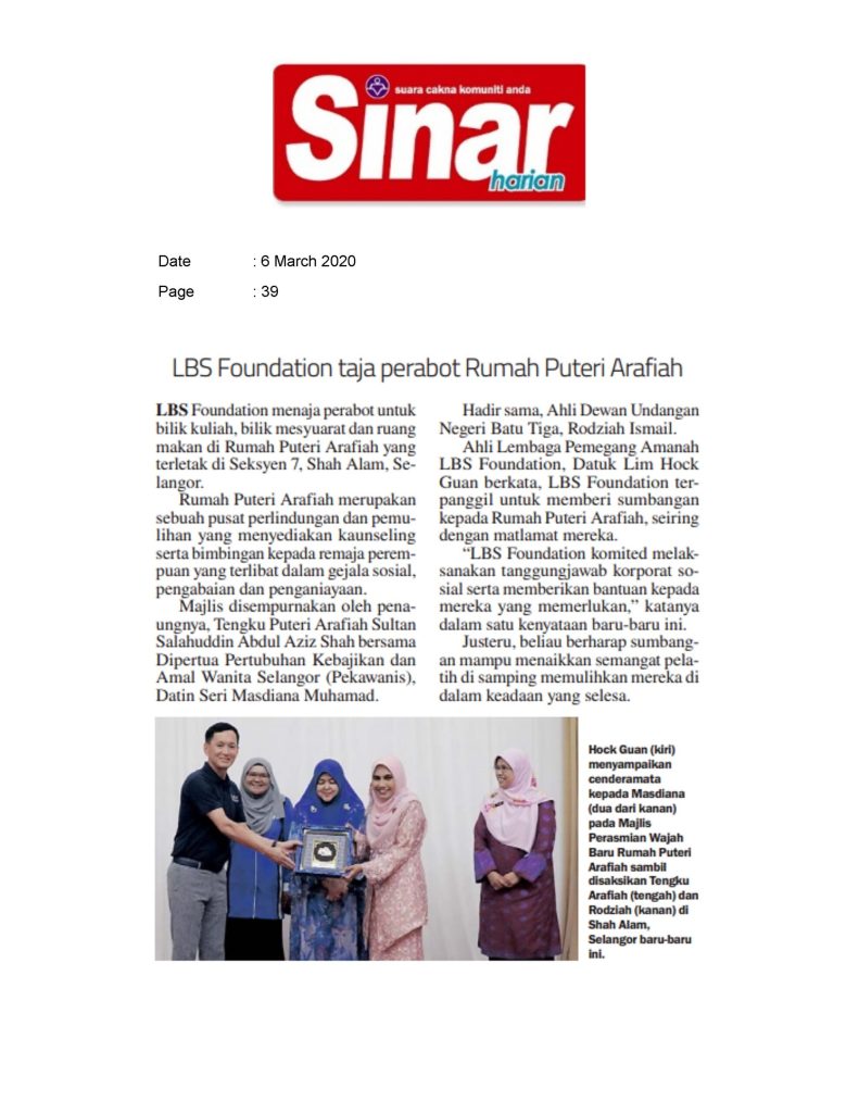 2020.03.06 Sinar Harian – LBS Foundation taja perabot Rumah Puteri Arafiah