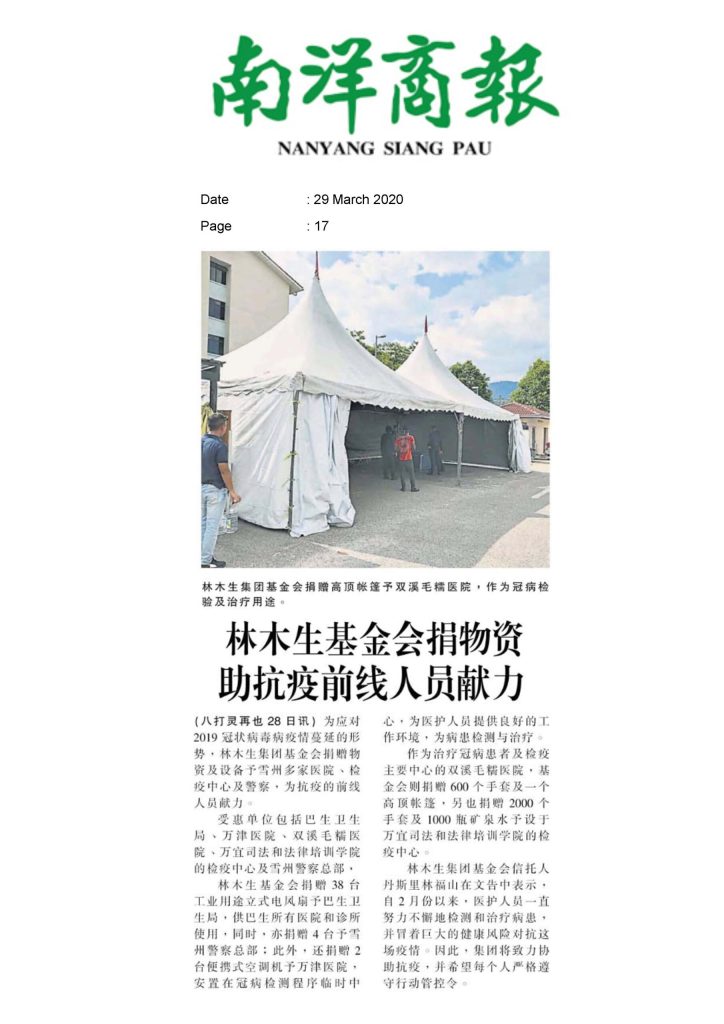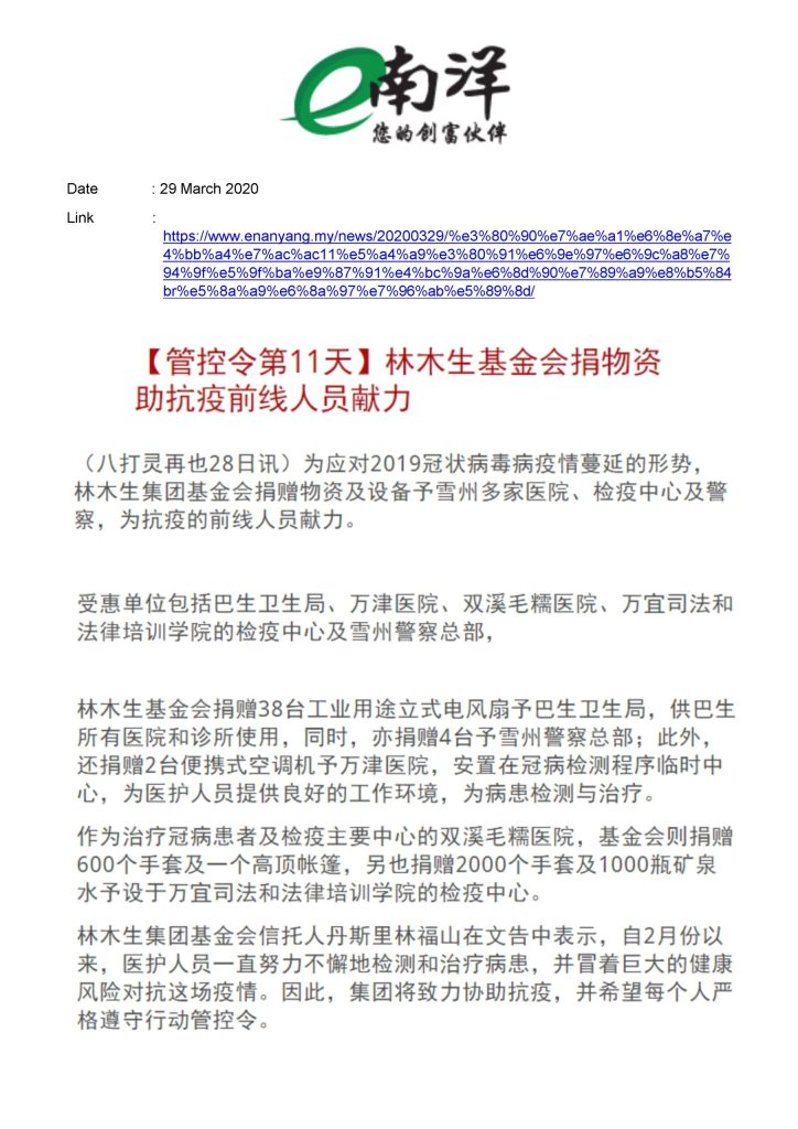 2020.03.29 Sin Chew – LBS Foundation donates materials and equipments to medical staff in Selangor