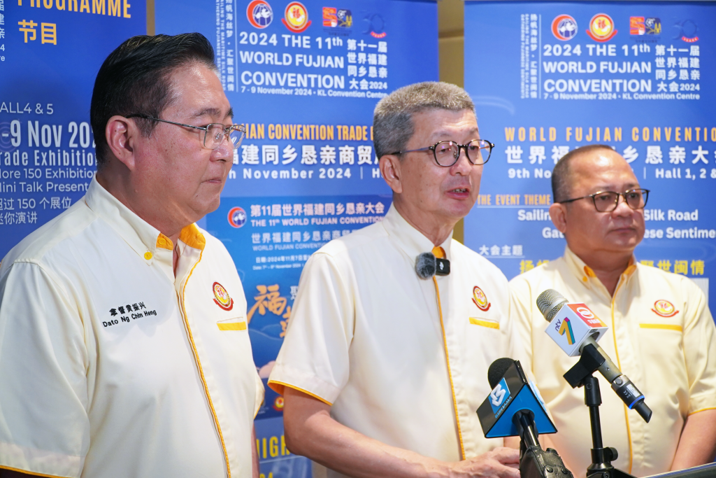 Tan Sri Ir (Dr.) Lim Hock San, President of The Federation of Hokkien Associations of Malaysia (TFHAM), together with high council members of TFHAM during the press conference of the 11th World Fujian Convention, Kuala Lumpur held at the LBS Headquarters.