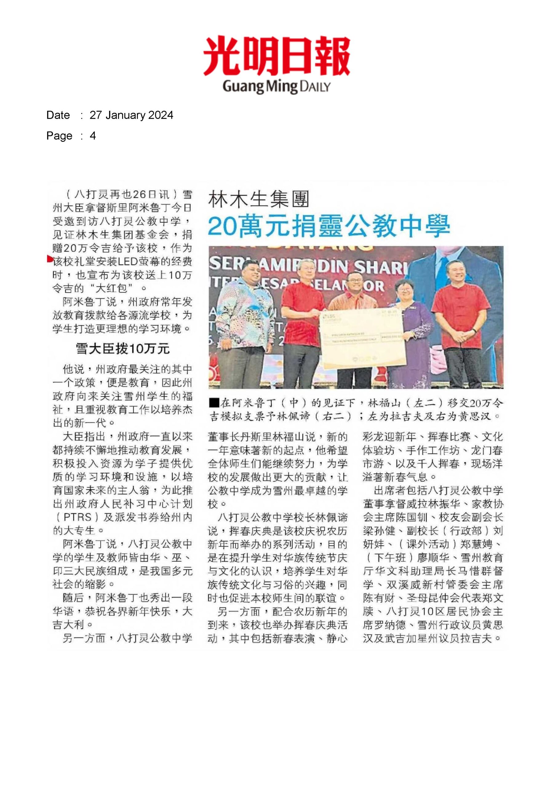 2024.01.27 Guang Ming – LBS Bina Group donates RM200,000 to Catholic High School