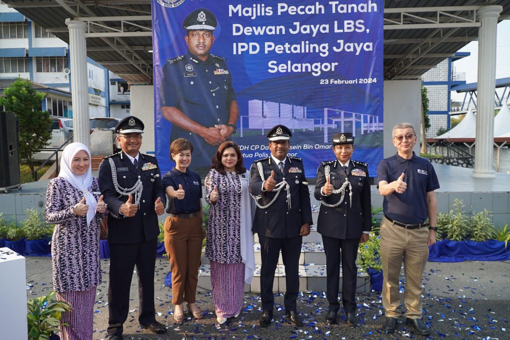 Tan Sri Ir (Dr.) Lim Hock San, the Group Executive Chairman of LBS Bina Group and LBS Foundation board of trustees, alongside Dato Cynthia Lim, Board of trustees LBS Foundation, YDH CP Dato’ Hussein Omar Khan, Selangor Police Chief, YBhg Datin Liliyana Haryani Dato’ Mohd Harunizam, Chairman of PERKEP Selangor, YDH DCP Dato’ Sasikala Devi Subramaniam, Selangor Deputy Police Chief, YDH ACP Mohamad Fakhrudin Abdul Hamid, Petaling Jaya District Police Chief, YBhg Pn Roshimah Chik, at the Dewan Jaya LBS ground breaking ceremony, IPD Petaling Jaya.