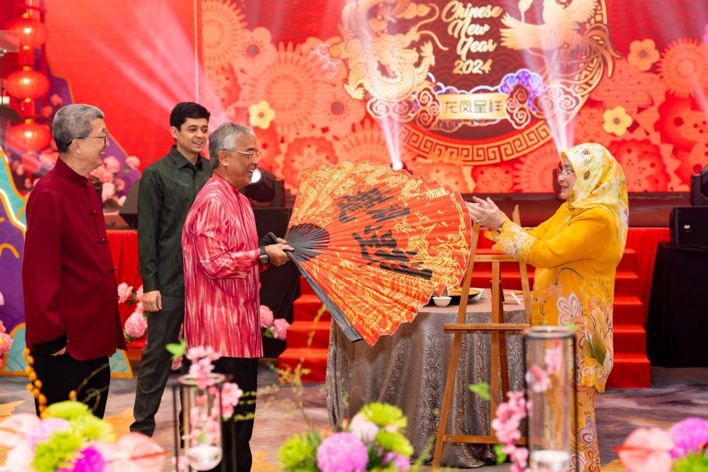 His Majesty Seri Paduka Baginda the Yang Di-Pertuan Agong alongside the Chinese Calligraphy fan as a symbolic opening of the event at Majlis Menjunjung Kasih and LBS Chinese New Year Celebration 2024 at Shangri-La Hotel Kuala Lumpur.