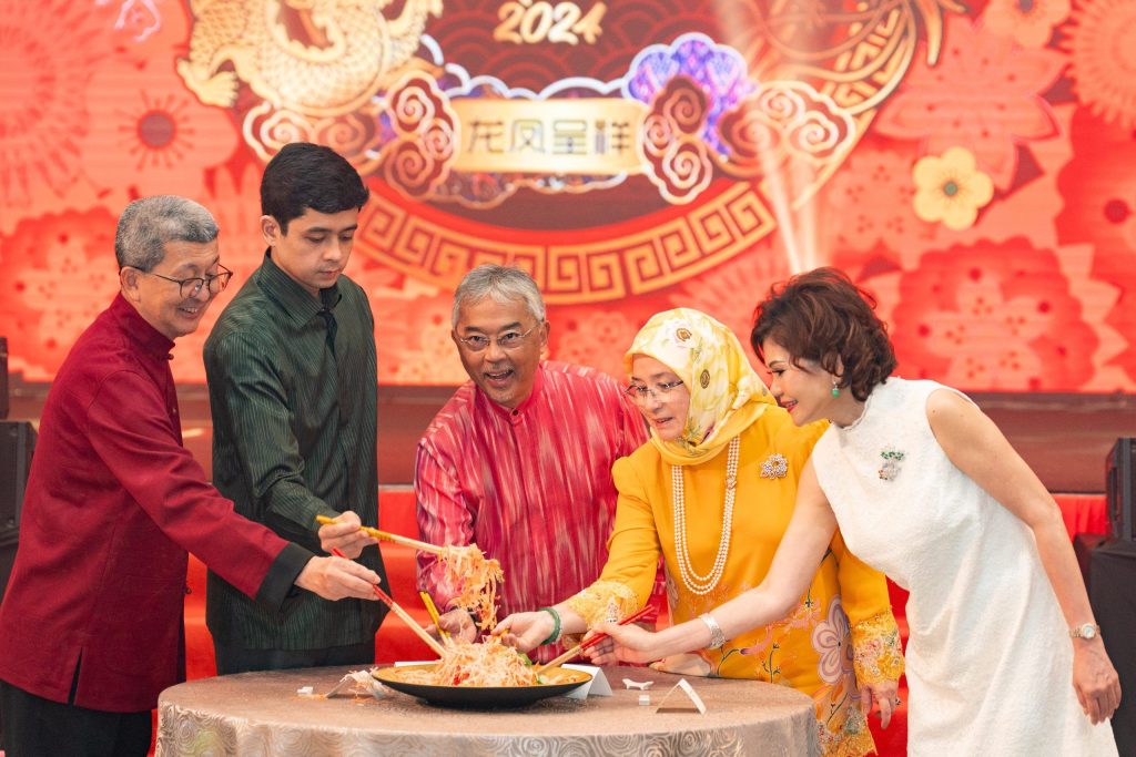 His Majesty Seri Paduka Baginda the Yang Di-Pertuan Agong,  DYMM Seri Paduka Baginda The Raja Permaisuri Agong and DYMM Pemangku Raja Pahang, participated in tossing the ‘Yee Sang’ alongside Tan Sri Ir. (Dr.) Lim Hock San, Group Executive Chairman of LBS and Puan Sri.