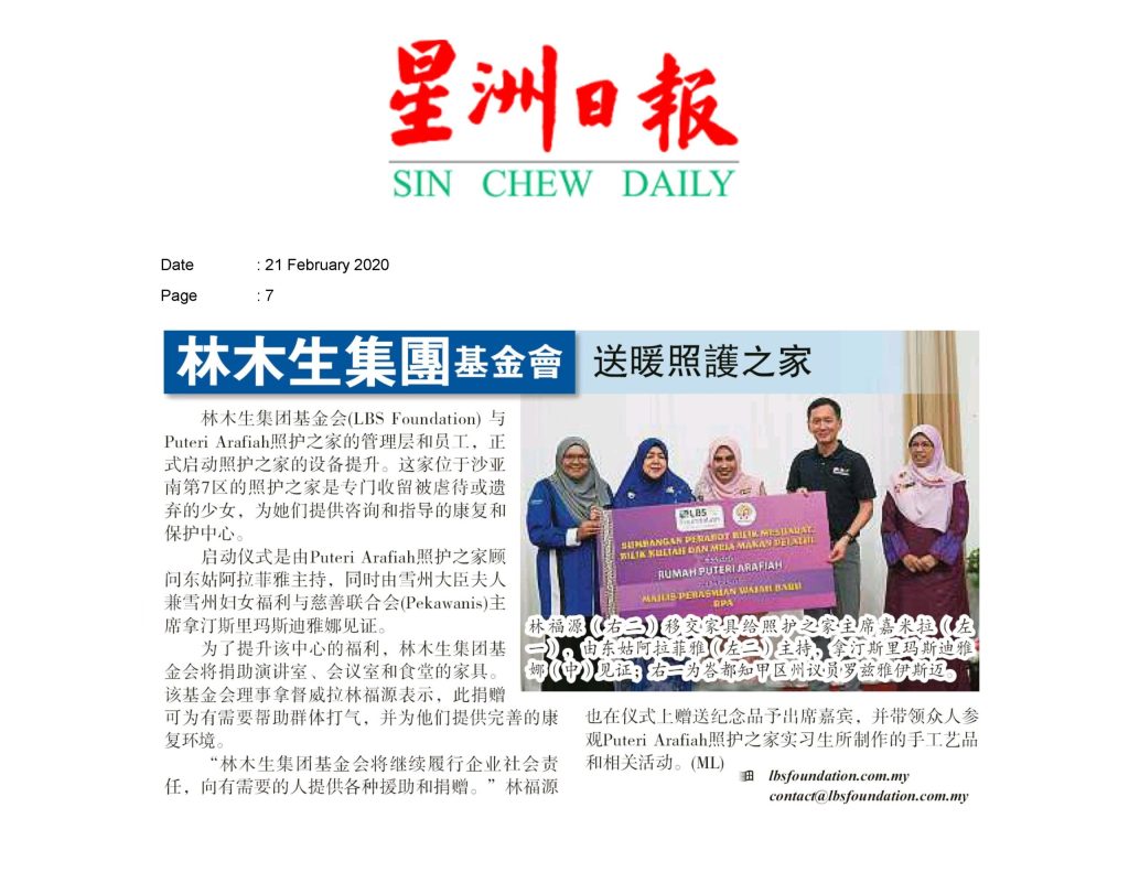 2020.02.21 Sin Chew – LBS Foundation gives donation to Puteri Arafiah Home
